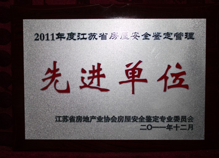 2011年12月16日,在江苏省房地产业协会房屋安全鉴定专业委员会2011年会员大会上,我处房屋安全鉴定管理所被授予江苏省2011年度房屋安全鉴定管理先进单位荣誉称号。