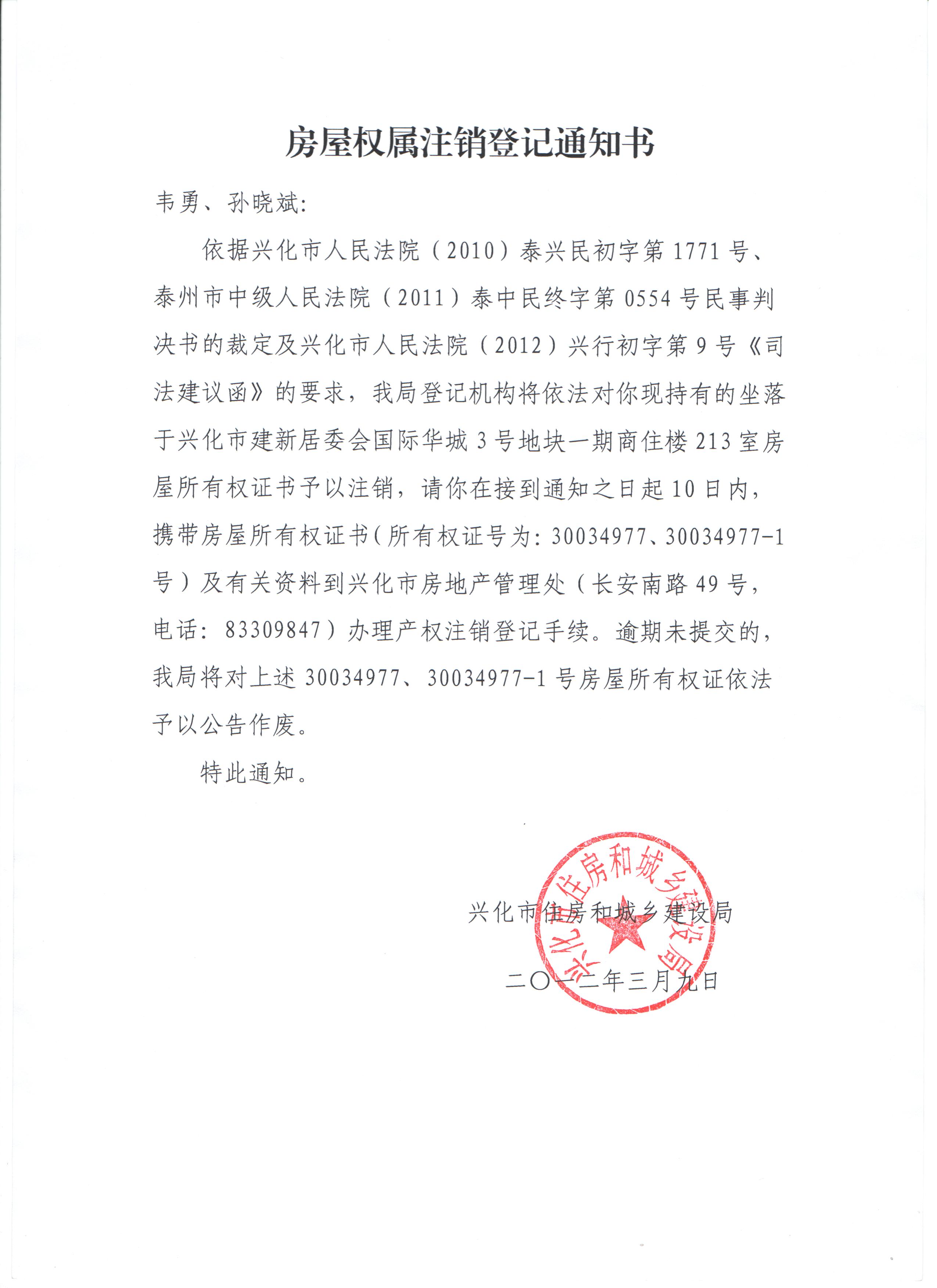 房屋权属注销登记通知书 韦勇、孙晓斌: 依据兴化市人民法院(2010)泰兴民初字第1771号、泰州市中级人民法院(2011)泰中民终字第0554号民事判决书的裁定及兴化市人民法院(2012)兴行初字第9号《司法建议函》的要求,我局登记机构将依法对你现持有的坐落于兴化市建新居委会国际华城3号地块一期商住楼213室房屋所有权证书予以注销,请你在接到通知之日起10日内,携带房屋所有权证书(所有权证号为:30034977、30034977-1号)及有关资料到兴化市房地产管理处(长安南路49号,电话:83309847)办理产权注销登记手续。逾期未提交的,我局将对上述30034977、30034977-1号房屋所有权证依法予以公告作废。 特此通知。