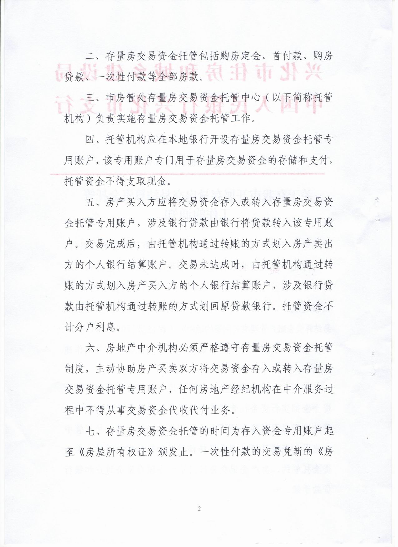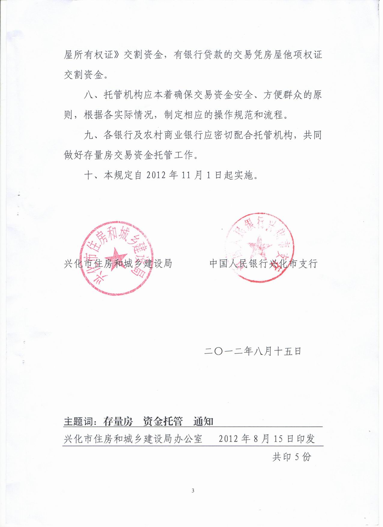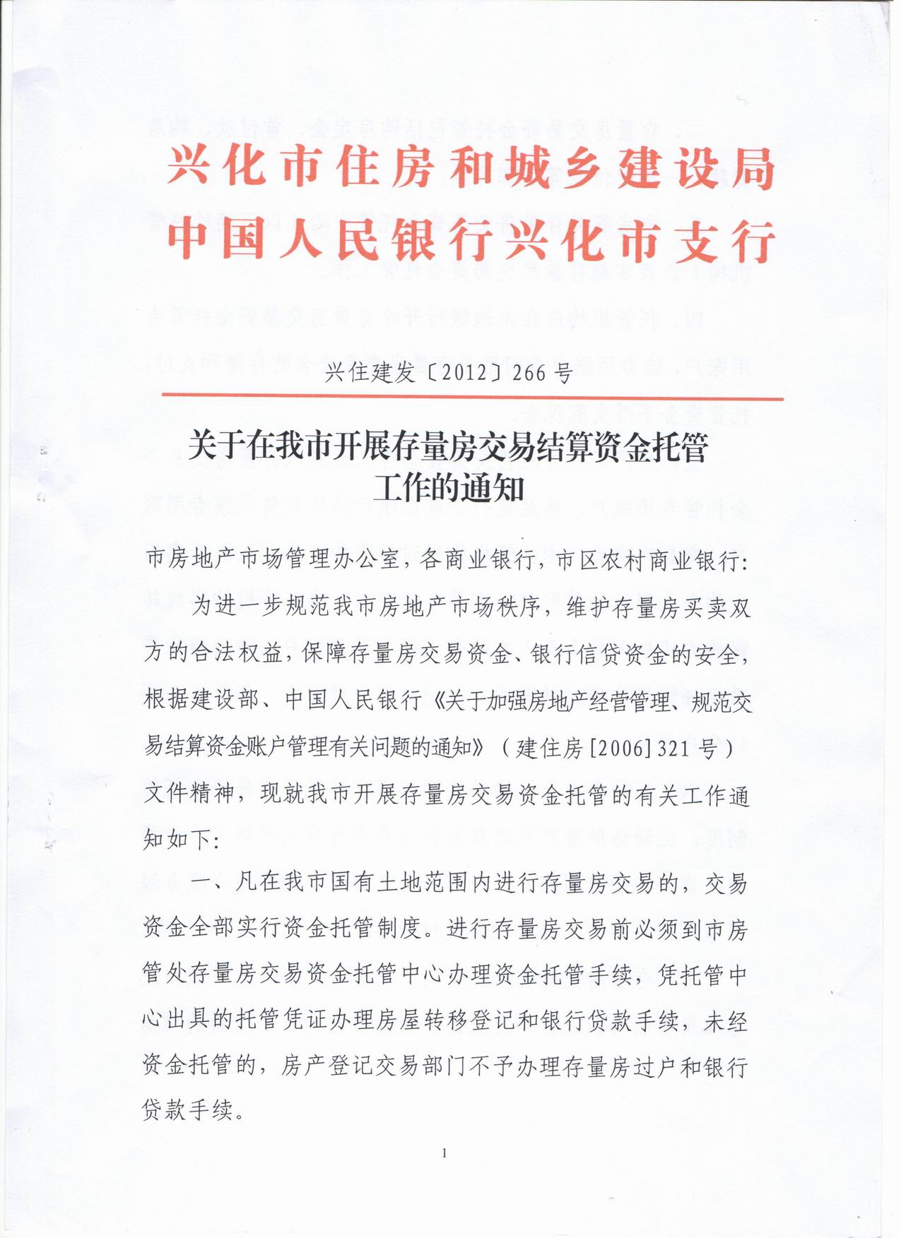 兴化市住房和城乡建设局 中国人民银行兴化市支行 兴住建发〔2012〕266号 关于在我市开展存量房交易结算资金托管工作的通知 市房地产市场管理办公室,各商业银行,市区农村商业银行:
