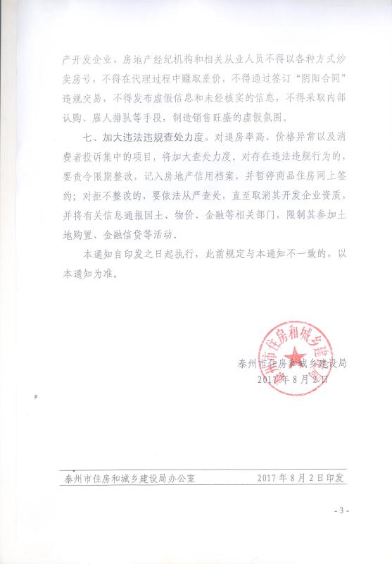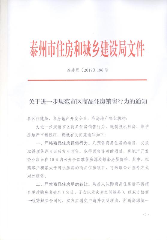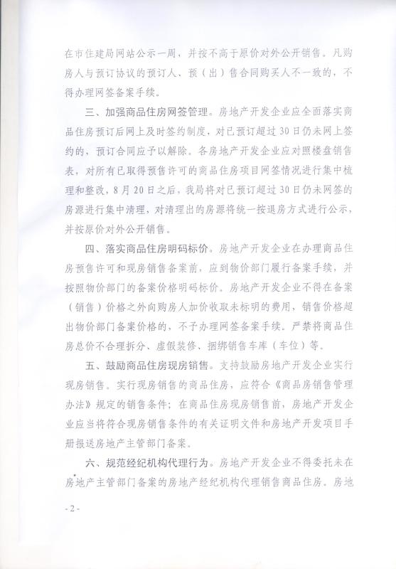 各区住建局,各房地产开发企业,各房地产经纪机构: 为进一步规范市区商品住房销售行为,遏制投机炒房、维护房地产市场秩序,现就有关问题通知如下: 一、严格商品住房预售行为。凡预售商品住房的项目,必须取得预售许可证后方可预售。取得预售许可的项目,房地产开发企业应当在10日内公开全部准售房源及每套房屋价格。其中,拟购客户积累大于可供房源的商品住房项目,可采取公开摇号方式对外销售。 二、严禁商品住房期房转让。购房人认购商品住房后不得擅自更改购房者姓名(父母、子女以及夫妻之间除外),经双方协商一致需解除合同的,双方应递交申请并说明理由,所退房源统一在市住建局网站公示一周,并按不高于原价对外公开销售。凡购房人与预订协议的预订人、预(出)售合同购买人不一致的,不得办理网签备案手续。 三、加强商品住房网签管理。房地产开发企业应全面落实商品住房预订后网上及时签约制度,对已预订超过30日仍未网上签约的,预订合同应予以解除。各房地产开发企业应对照楼盘销售表,对所有已取得预售许可的商品住房项目网签情况进行集中梳理和整改,8月20日之后,我局将对已预订超过30日仍未网签的房源进行集中清理,对清理出的房源将统一按退房方式进行公示,并按原价对外公开销售。 四、落实商品住房明码标价。房地产开发企业在办理商品住房预售许可和现房销售备案前,应到物价部门履行备案手续,并按照物价部门的备案价格明码标价。房地产开发企业不得在备案(销售)价格之外向购房人加价收取未标明的费用,销售价格超出物价部门备案价格的,不予办理网签备案手续。严禁将商品住房总价不合理拆分、虚假装修、捆绑销售车库(车位)等。 五、鼓励商品住房现房销售。支持鼓励房地产开发企业实行现房销售。实行现房销售的商品住房,应符合《商品房销售管理办法》规定的销售条件;在商品住房现房销售前,房地产开发企业应当将符合现房销售条件的有关证明文件和房地产开发项目手册报送房地产主管部门备案。 六、规范经纪机构代理行为。房地产开发企业不得委托未在房地产主管部门备案的房地产经纪机构代理销售商品住房。房地产开发企业、房地产经纪机构和相关从业人员不得以各种方式炒卖房号,不得在代理过程中赚取差价,不得通过签订“阴阳合同”违规交易,不得发布虚假信息和未经核实的信息,不得采取内部认购、雇人排队等手段,制造销售旺盛的虚假氛围。 七、加大违法违规查处力度。对退房率高、价格异常以及消费者投诉集中的项目,将加大查处力度。对存在违法违规行为的,要责令限期整改,记入房地产信用档案,并暂停商品住房网上签约;对拒不整改的,要依法从严查处,直至取消其开发企业资质,并将有关信息通报国土、物价、金融等相关部门,限制其参加土地购置、金融信贷等活动。 本通知自印发之日起执行,此前规定与本通知不一致的,以本通知为准。
